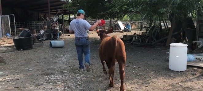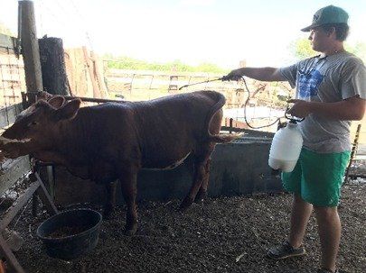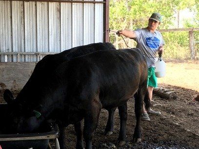 Spraying heifers for flies.